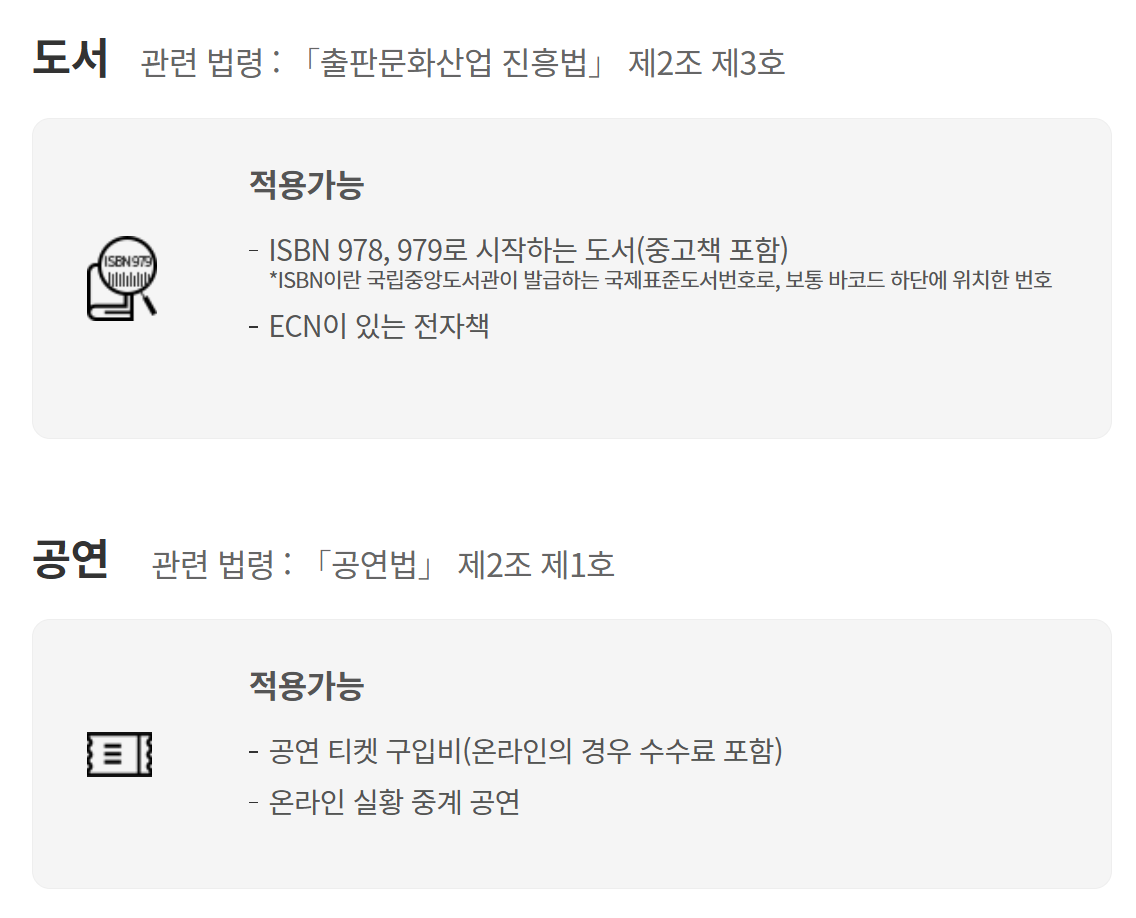 도서 구매는 15%, 공연과 영화 관람은 30%가 공제됩니다.