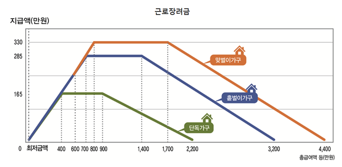 근로소득이 일정 기준 이하일수록 지급액이 커지며,